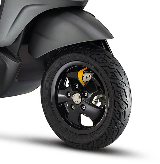 The scooter has a removable 48 ஆம்பியர் மணி Lithium battery for a driving range of 100 கிமீ.